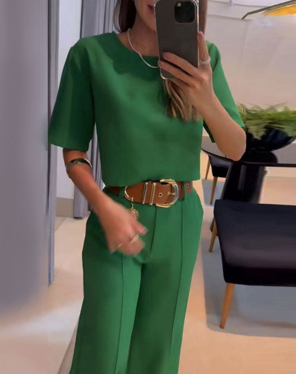 Visual sofisticado e coerente: o conjunto transmite elegância e unidade no look.
