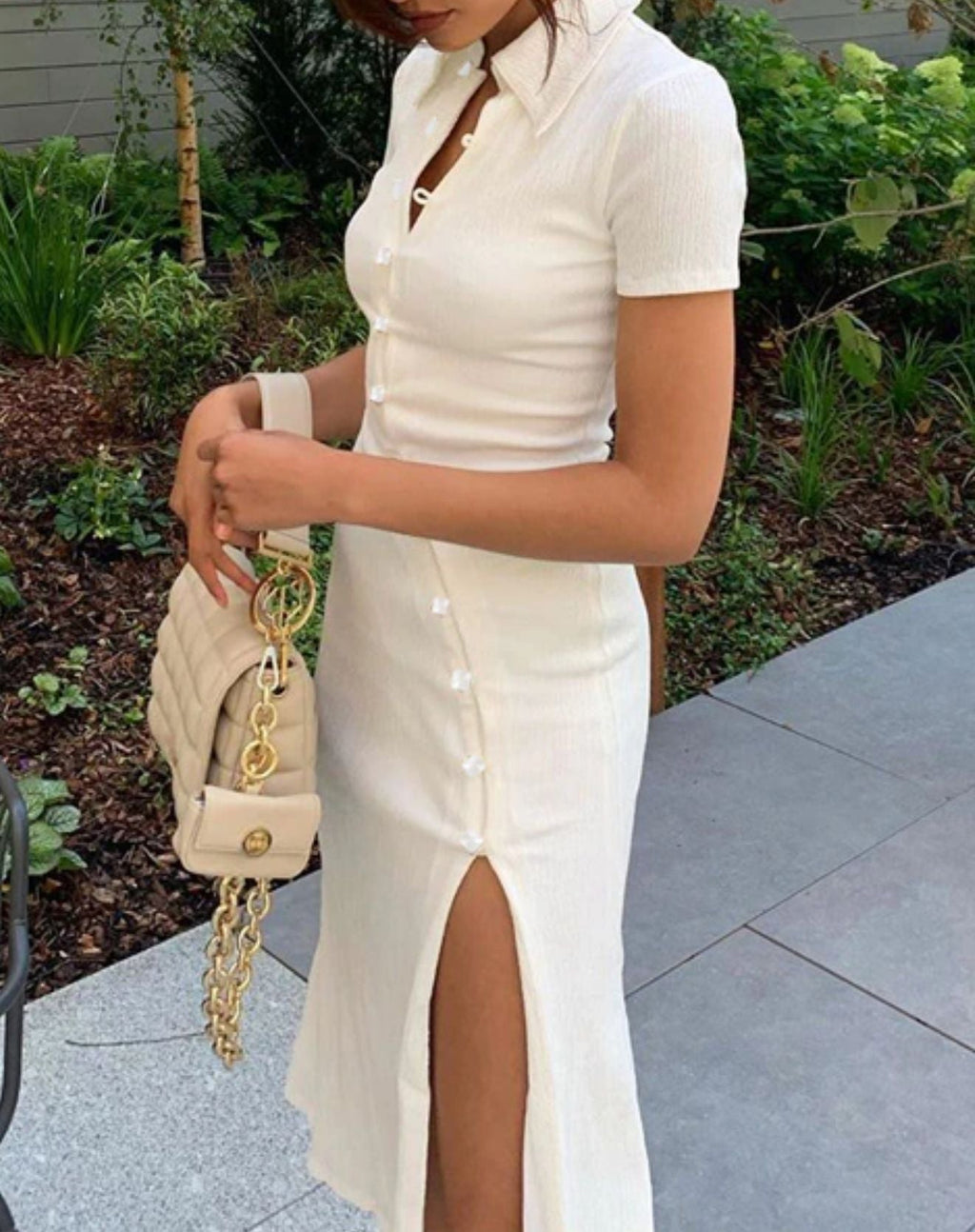 O VESTIDO CURVE BUTTONS tem a classe que você estava procurando. Ele se atenta aos detalhes deixando toda a mulher que o veste elegante, possuindo uma linha curva de botões, fenda, gola e mangas curtas, essa é a peça encantadora que você vai adorar.