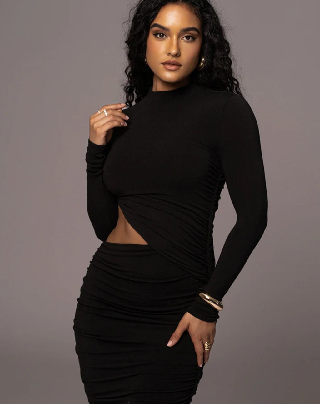 O modelo apresenta corte diferenciado na cintura, mangas longas, mini gola e franzido frontal, criando um design sofisticado e versátil. O comprimento midi garante elegância, enquanto o tecido leve e maleável proporciona conforto e liberdade de movimento.