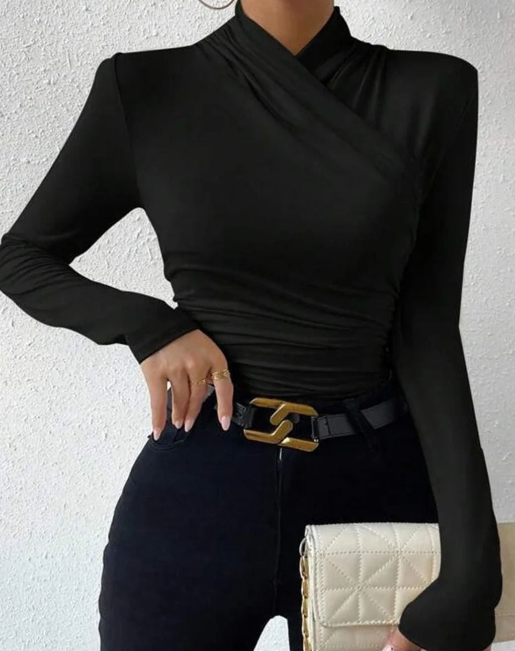 Estilosa e elegante, ela chegou para dar um UP em suas combinações. A BLUSA CURVELO COM GOLA TRANSPASSADA E MANGAS LONGAS é a peça diferenciada que você precisa para essa estação, além de possuir uma versatilidade incrível para compor diferentes looks. A blusa possui manga longas, pregas frontais e costas lisas, gola transpassada, justa ao corpo e confeccionada em tecido leve e macio.