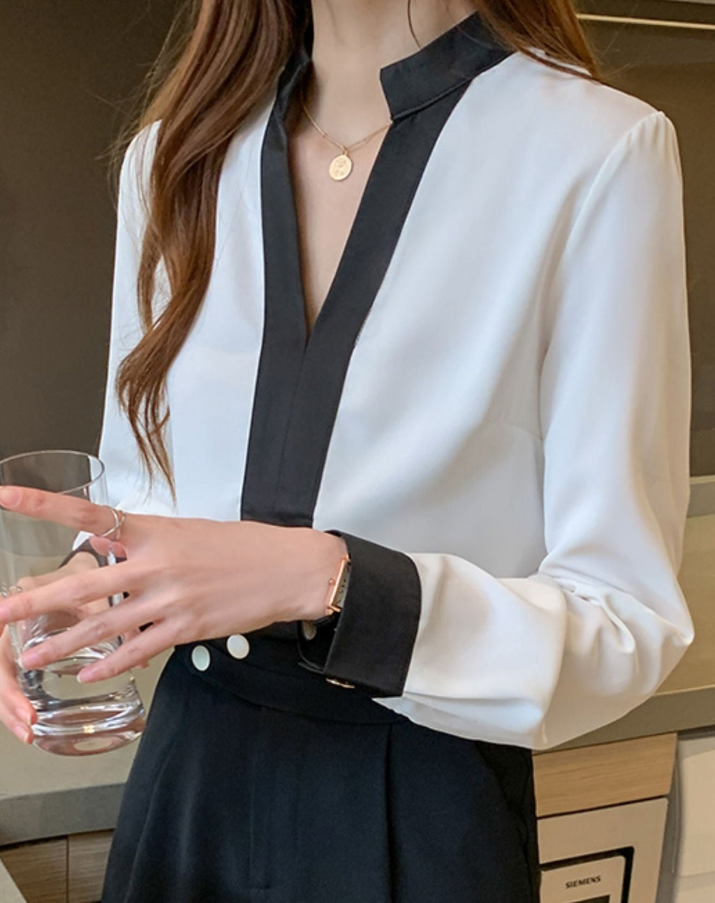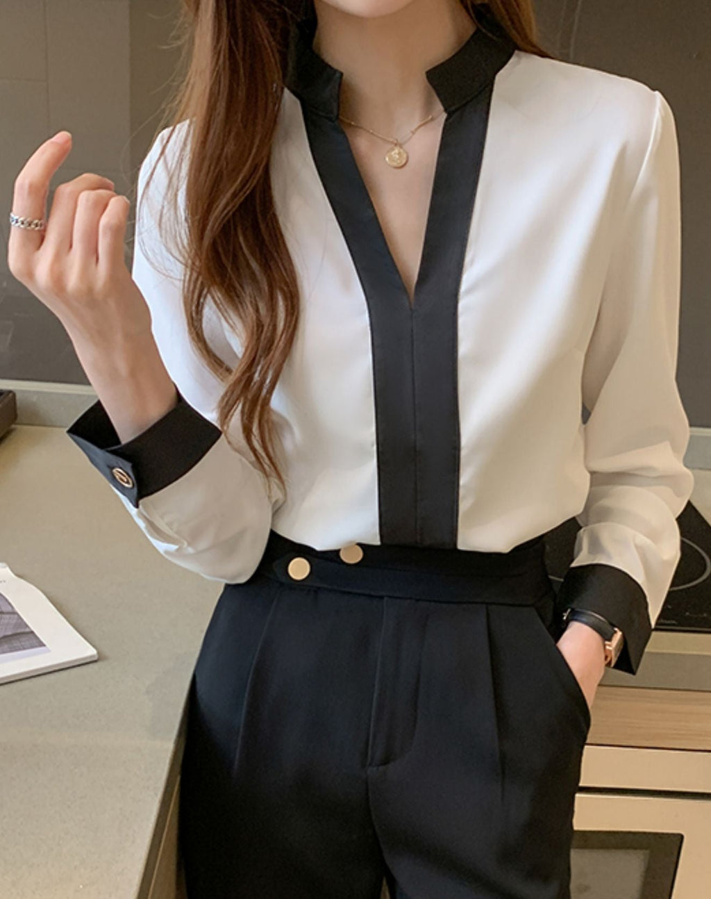 Uma peça chic e diferenciada para os compromissos diários e, para aquele eventos especial. A BLUSA MISSURE COM DECOTE V E MINI GOLA possui detalhes elegantes e minimalistas, podendo ser combinada em diversas propostas de looks e em todas as estações. Possui mangas longas, decote em V com mini gola, detalhe em preto no centro da peça e na barra dos punhos, juntamente com fechamento por botões e comprimento regular.