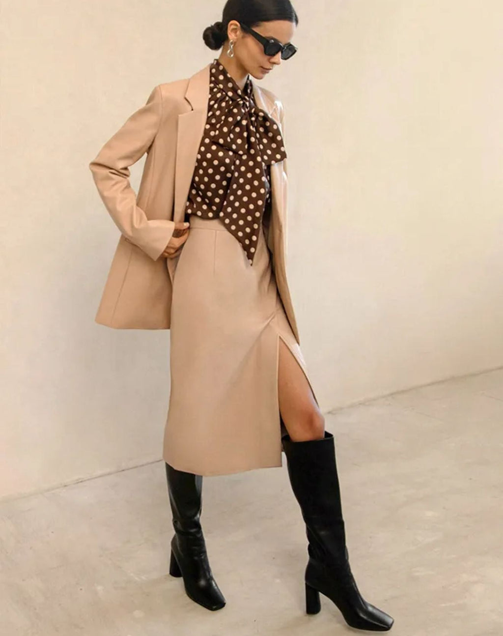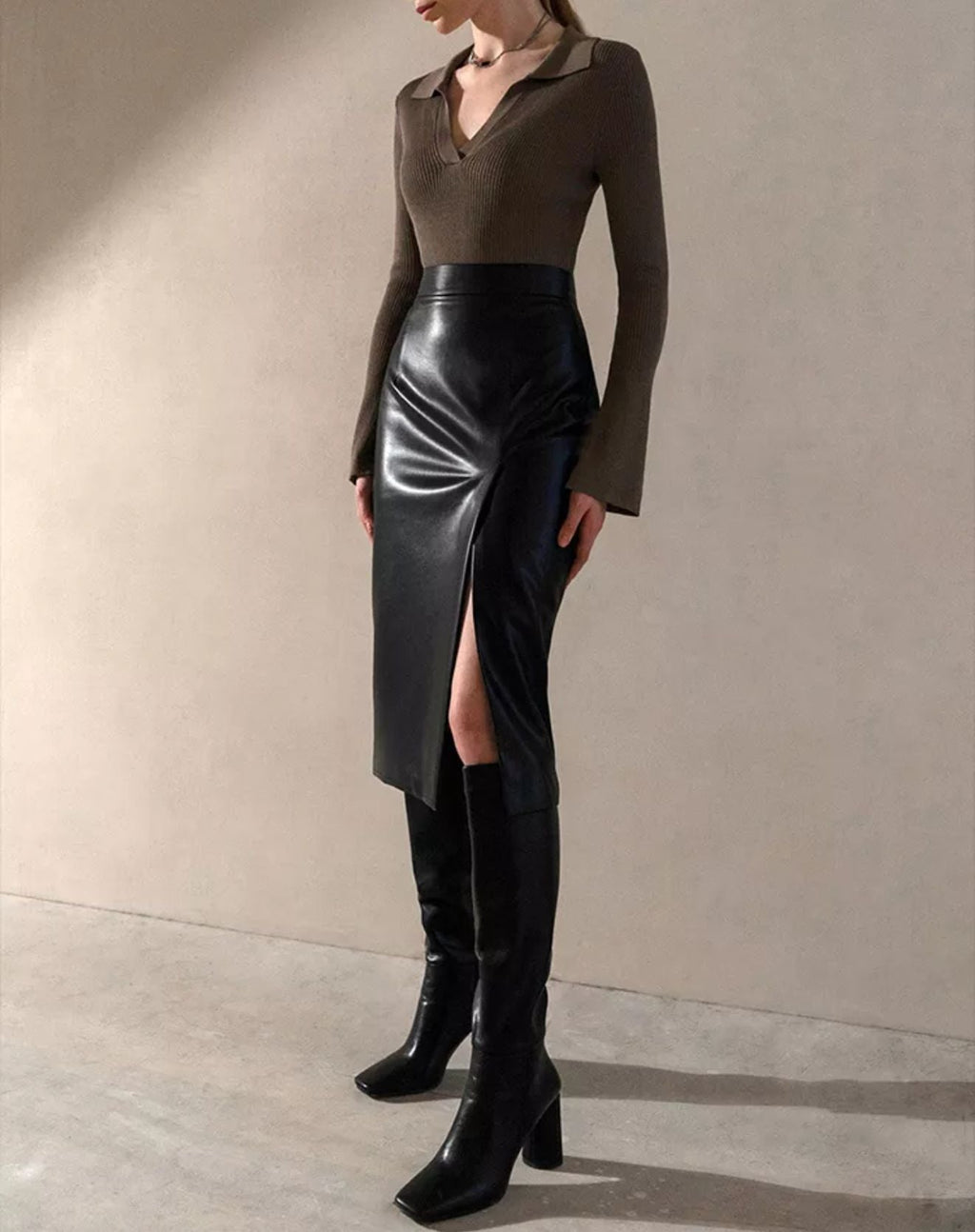 Se você quer uma peça que não é básica, mas também não pende só para o exagero, essa saia é perfeita. Ela une o visual urbano do courino com a elegância de uma fenda estratégica — é uma peça pensada para mulheres que têm atitude e estilo próprio.